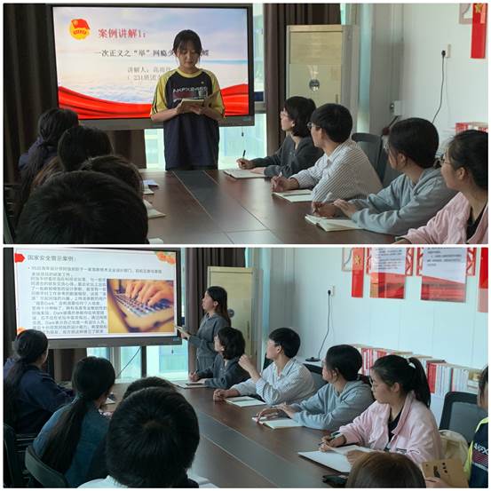 23级1班团支部书记高雨欣、23级2班团支部书记刘鑫,搜集网络素材,为大家讲解了两个发生在身边的危害国家安全的典型案例。案例触目惊心、发人深思。
