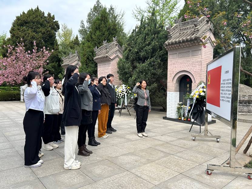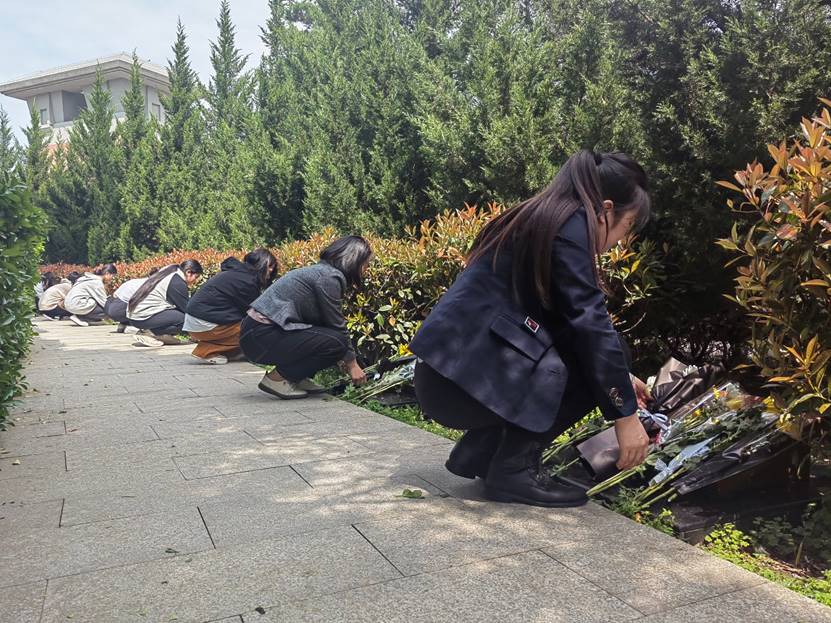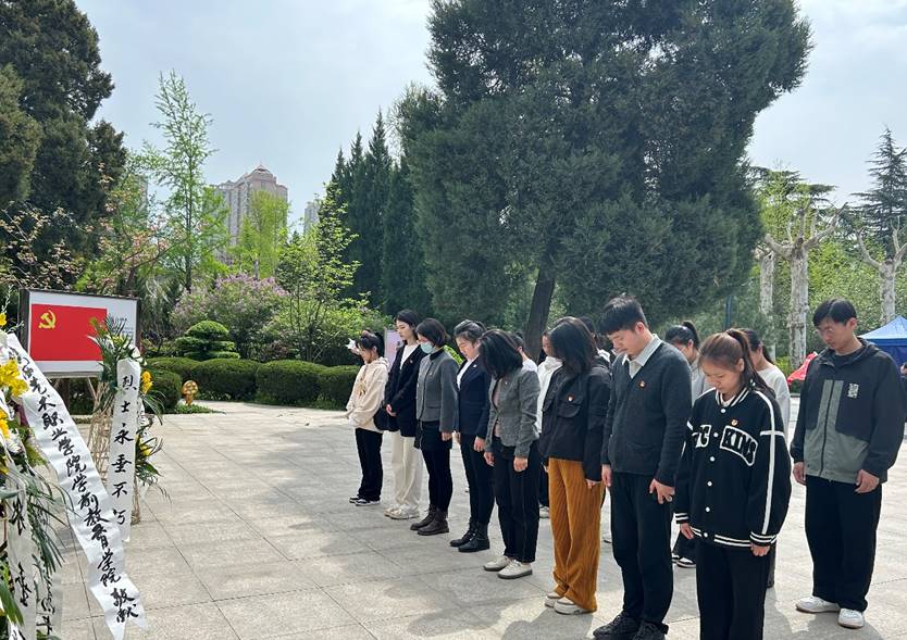 在庄严肃穆的陵园内,学院师生怀着敬畏之心和崇高敬意为烈士敬献花圈,鞠躬默哀表达自己对革命烈士们的沉痛悼念和深切缅怀。