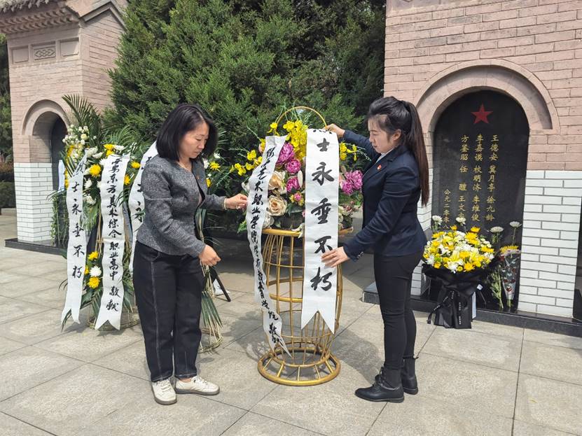 红色血脉奔流不息,革命精神代代相传。站在烈士墓前,师生们久久凝望。他们在感悟前辈们为了革命胜利慷慨赴国、英勇就义的伟大壮举,感慨革命先烈不怕牺牲、顽强斗争的大无畏革命精神,信念之火在他们内心熊熊不息,他们为烈士们擦拭墓碑、敬献鲜花,表达自己崇高的敬意。