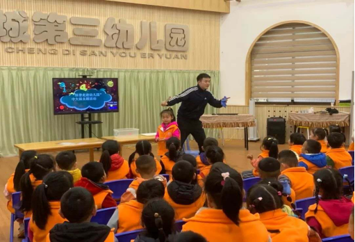 为贯彻落实《陕西省学前教育质量提升计划(2017—2020年)》、《中共陕西省委陕西省人民政府关于学前教育深化改革规范发展的实施意见》等文件精神,不断深化产教融合,加深院园合作, 10月28日,学管系早教教研室主任王辉洪,受西安市东城第三幼儿园邀请,为中、大班小朋友带来一场有趣的“科普实验小课堂”活动。小朋友们在王老师的引导下,开启了一场科学实验探究之旅。活动中王辉洪老师以故事《小铁圈飞行记》引出主题,通过《神奇的静电》、《纸桥》、《吸力大王》、《小木棍大力士》四个不同的实验,引导幼儿感受科学的神奇。实验过程中,幼儿主动提问、积极探索,与老师共同寻找问题答案。