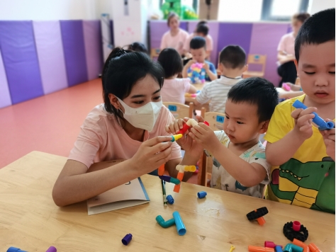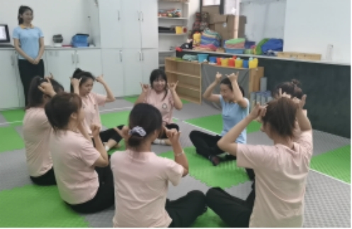 接下来分组进行感统早教课、音乐早教课和全脑开发课程的观摩活动,早教活动中机构老师带着家长和小朋友们一起玩体能游戏、音乐游戏,并利用蒙氏教具学习数学,锻炼幼儿的精细动作,在实操中提高幼儿的认知水平。学生们认真观摩并做好观摩记录,此环节是将学校所上的专业核心课程:《早期教育活动设计与实施》中:奥尔夫音乐早教课程、蒙氏早教课程、感觉统合早教课程、多元智能早教课程和亲子活动早教课程与机构中实际所开展的早教活动进行有效衔接。